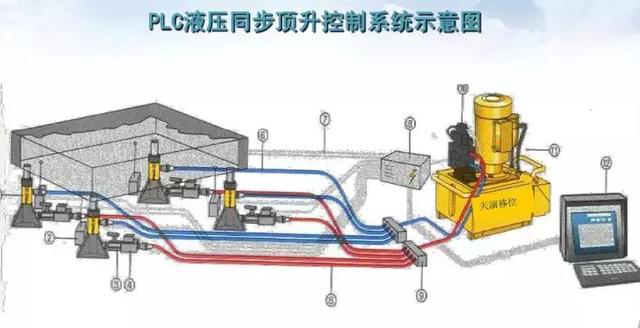 主引橋均采用PLC 控製液壓同步頂升技術。本處采用位移控製,力監控的方法。同步控製精度為±1.0 mm,這樣就可以很好地保證頂升過程的同步性,確保頂升時上部結構的安全。頂升行程監測:采用精度為0.1 mm 的位移傳感器;對主橋采用12 點同步控製係統進行頂升,每個控製點對應於千斤頂分組點。