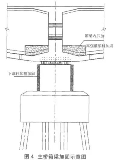 主橋大跨徑連續梁整體頂升方案:對主橋中墩邊墩采用直接頂升法,以墩柱為反力基礎,在墩柱與箱梁底之間安裝頂升千斤頂,通過PLC 電腦同步控製下整體頂升箱梁的方法實現抬高主橋橋麵標高的目的。此方法的優點是頂升時基本不改變原有橋梁的受力體係,受力較明確。考慮受力需要,頂升前,對主墩進行加粗,對邊墩加抱箍;對連續梁頂升位置處進行局部加固;設置必要的鋼結構限位裝置,預警頂升過程中產生橫向、縱向偏移。